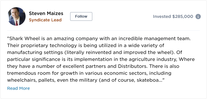 This means that if Shark Wheel is able to close the transaction, investors may be able to realize the upside in a relatively short amount of time. To protect investors in this round against valuation, we chose to offer a convertible note (your valuation is expected to be determined by sophisticated investors at a later date).