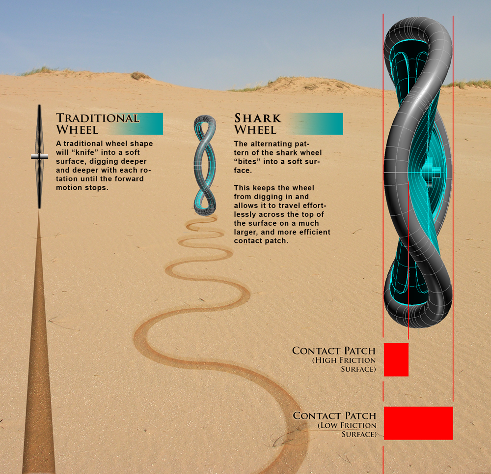 - Scienticially proven advantages. Shark Wheel has defined performance advantages that include rolling resistance, obstacle avoidance, rebound, rutting, longevity and more.
